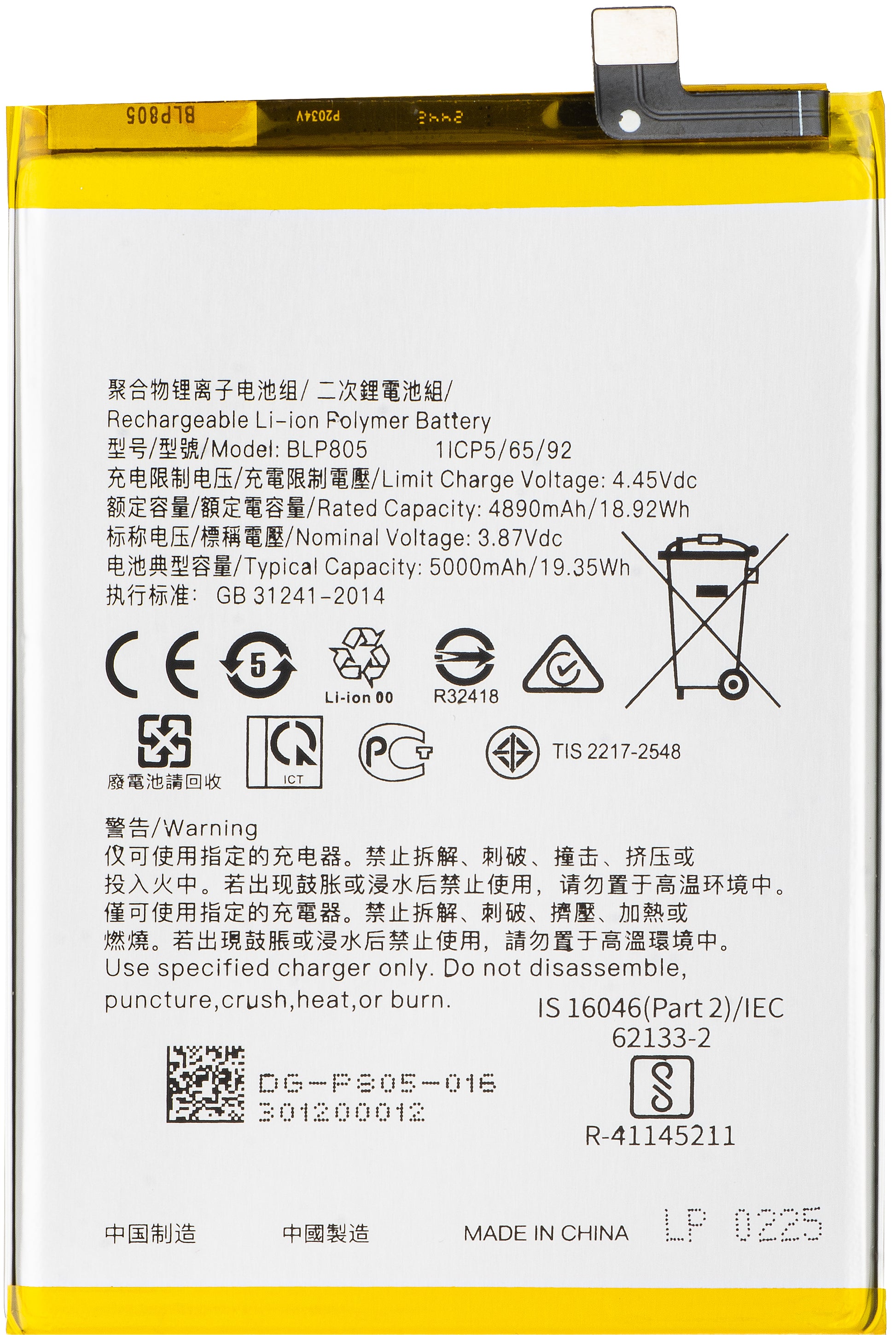 Battery for Oppo A16s / A16 / A74 5G / A54 5G / A93 5G, BLP805