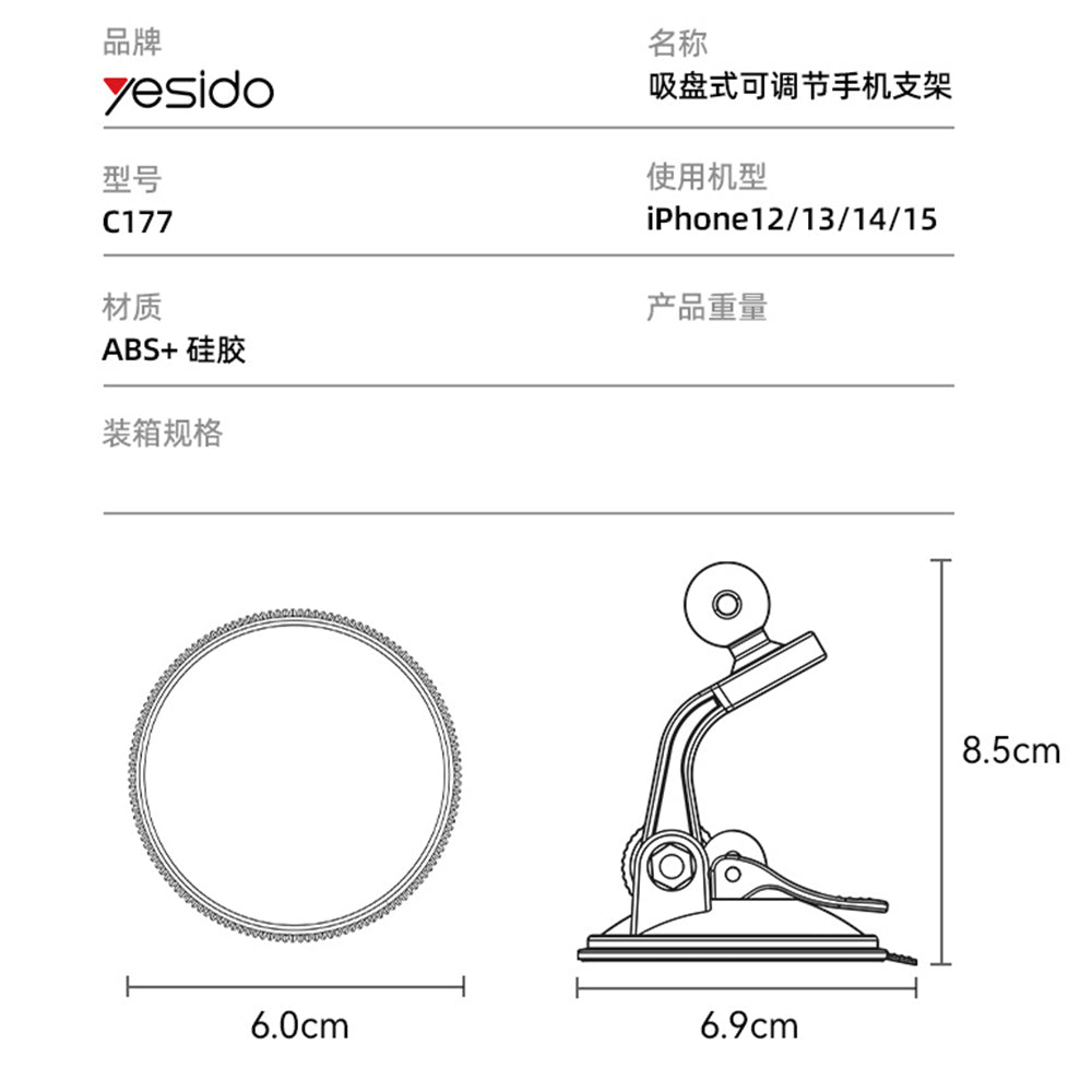 The magnetic holder from Yesido is incredible! Durable. Reusable. Stable. Looking for a magnetic car holder? You've come to the right place! This magnetic holder from Yesido is an ideal accessory in your car. It is adjustable and has incredible resistance even on the most uneven roads. You won't worry about your phone slipping. Order now! A practical magnetic holder This magnetic holder from Yesido is reusable. Incredible, isn't it? You can position the holder both on the car's windshield and on a desk. Purchase it now! Specifications: Materials: ABS, polycarbonate, silicone, metal; Weight: 138g; Dimensions: 8.5 x 6.9cm; Compatibility: Iphone 12/13/14/15.