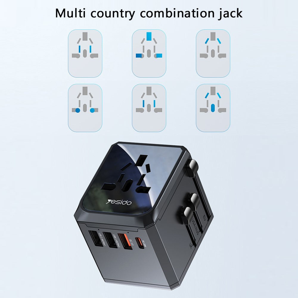 Yesido MC24 Travel Network Charger, 20W, 3A, 3 x USB-A - 1 x USB-C, Black
